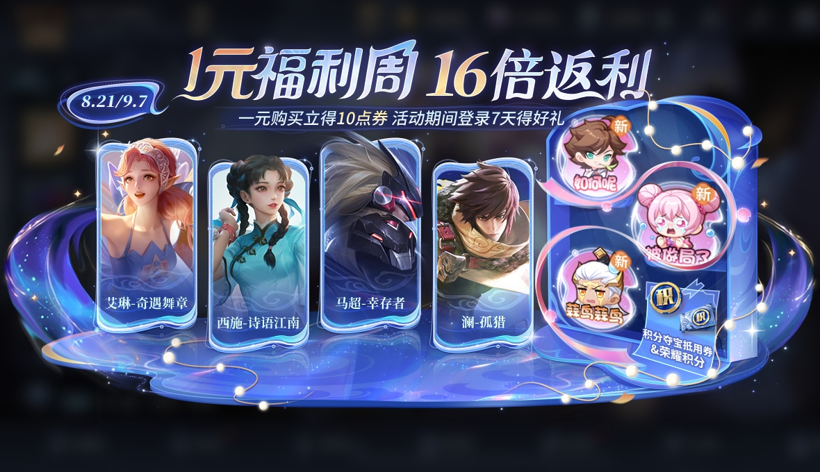 活動(dòng)簡(jiǎn)介:在活動(dòng)內(nèi)1元購(gòu)買10點(diǎn)券,登錄7天可領(lǐng)16倍返利,還可隨機(jī)獲得皮膚,全新個(gè)性表情或積分奪寶抵用券其中之一!