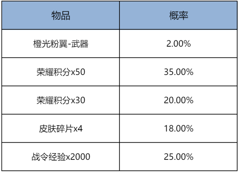 購(gòu)買禮包必得酷炫機(jī)甲(1日),可額外隨機(jī)獲得以下之一:榮耀積分x50、榮耀積分x30、皮膚碎片x4、戰(zhàn)令經(jīng)驗(yàn)x2000、橙光粉翼-武器。累計(jì)50次必得橙光粉翼-武器。