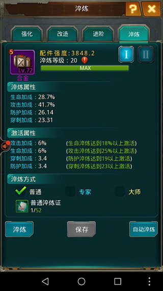 第一,你要先把配件用普通資源硅淬煉滿15-17級最好,把那些屬性淬煉大概到0.6左右,也就是比如17級淬煉穿刺滿是15,那你就必須要把穿刺搞到9左右,大概上下波動8-10也是可以的,也不是說一定要多準(zhǔn)確,之后就用硅把配件淬煉到滿級到20級,如果有好的屬性,別急著保存,先看下,因為你是想要激活終極4個隱藏屬性的,所以,你要忍住,到了20級滿級,就可以用代金券去淬煉,不過在20級淬煉之前,能否獲得好屬性是看個人人品的,如果你淬煉后觸發(fā)了特別好的屬性,才建議你保存,要不就別保存了,保持淬煉到20級。