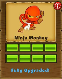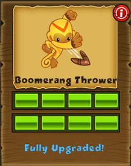 (每發(fā)飛鏢可以攻擊2個(gè)氣球)→(每發(fā)飛鏢可以攻擊3個(gè)氣球)→(每次可以發(fā)射三枚飛鏢)→(增加“變身”技能,把攻擊范圍內(nèi)的飛鏢猴變成超猴)