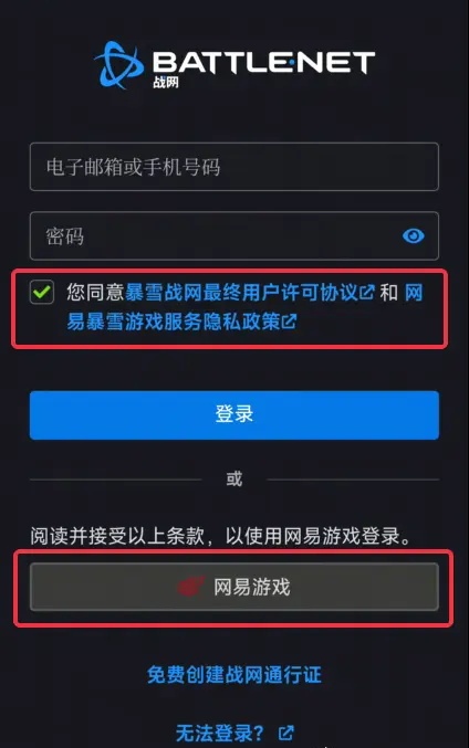 1.打開戰(zhàn)網(wǎng)客戶端時打開戰(zhàn)網(wǎng)網(wǎng)頁,閱讀并勾選同意條款,點擊 網(wǎng)易游戲 按鈕。