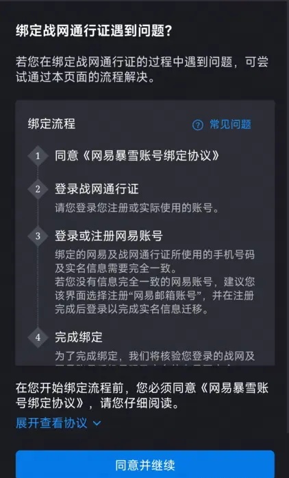 2.登錄網(wǎng)易賬號,請注意:新注冊網(wǎng)易賬號的綁定手機號碼需要與待綁定戰(zhàn)網(wǎng)通行證手機號碼相同,新注冊網(wǎng)易賬號與待綁定戰(zhàn)網(wǎng)通行證的實名信息需相同,閱讀綁定協(xié)議同意并繼續(xù)。