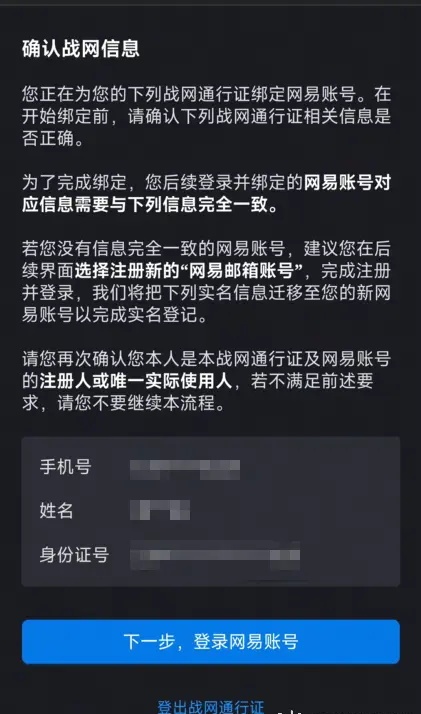 5.確認需要綁定的戰(zhàn)網(wǎng)通行證信息,點擊下一步,登錄網(wǎng)易賬號