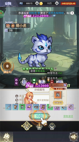 5、獲取寵物可以大大提升戰(zhàn)力,給寵物升級(jí)。