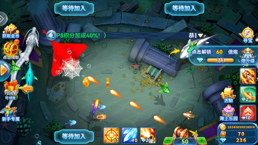 1、炮臺(tái)的使用倍率直接關(guān)系到捕捉效率。剛進(jìn)入游戲時(shí),可以用低倍炮捕捉小魚預(yù)熱,節(jié)省金幣。當(dāng)BOSS魚出現(xiàn)時(shí),再切換到高倍炮,集中火力攻擊,既能最大化收益,又能穩(wěn)扎穩(wěn)打地獲取獎(jiǎng)勵(lì)。