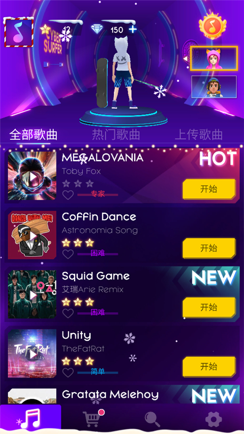 7、返回主頁面,挑選“全部歌曲”“熱門歌曲”或“上傳歌曲”,自由選擇你最愛的旋律開始挑戰(zhàn);