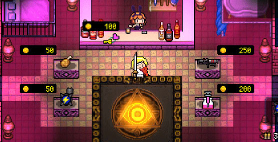 每一層的地圖中都有一名boss,打敗該boss后便能夠進(jìn)入下一層繼續(xù)冒險(xiǎn)。在戰(zhàn)斗過(guò)程中擊殺怪物或者開(kāi)啟寶箱都有幾率獲得金幣,這些獲得的金幣可以在商店處購(gòu)買(mǎi)道具和武器,商店的位置是在地圖中隨機(jī)生成的。并且在擊殺敵人時(shí),不僅僅有幾率掉落金幣,還會(huì)有一定幾率掉落“藍(lán)魂”,“藍(lán)魂”作為道具可在地圖中的NPC處解鎖道具槽以及人物動(dòng)作等一系列的額外附加功能。因?yàn)閞oguelike元素的存在,在流程中玩家在戰(zhàn)斗時(shí)被怪物擊殺,便會(huì)回到最開(kāi)始的初始房間“狄加瑪?shù)姆块g”里并且同時(shí)失去身上所有武器裝備,至于獲得的道具以及已解鎖的能力在死后可以保留。