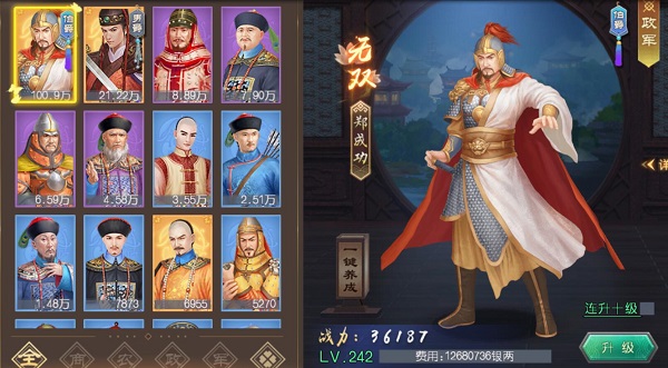 軍事升級(jí)主要是對(duì)關(guān)卡的貢獻(xiàn)。在此建議前期要偏向于商業(yè)大臣和軍事大臣,因?yàn)樯虡I(yè)提高后,征收會(huì)獲得更對(duì)的銀兩,而軍事提高后,有利于關(guān)卡戰(zhàn)斗力會(huì)相應(yīng)提高。在游戲前期盡快進(jìn)行關(guān)卡戰(zhàn)斗獲取君王經(jīng)驗(yàn),君王等級(jí)每提升一級(jí)會(huì)開(kāi)啟一次科舉選取,圣上們可以選擇自己喜愛(ài)的大臣冊(cè)封狀元,大臣升級(jí)是提升國(guó)力的最快最基本的方式。
