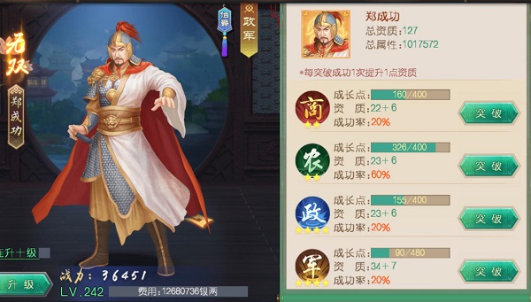 說(shuō)到培養(yǎng)大臣的資源,無(wú)非就是銀兩、資質(zhì)果、書(shū)籍,名臣升級(jí)需要用到銀兩,戰(zhàn)斗力的提升則需要資質(zhì)果和書(shū)籍,這些都是稀缺的資源。那么,應(yīng)該怎樣把這些資源最大化運(yùn)用,用現(xiàn)有的資源創(chuàng)造最大的國(guó)力值呢?