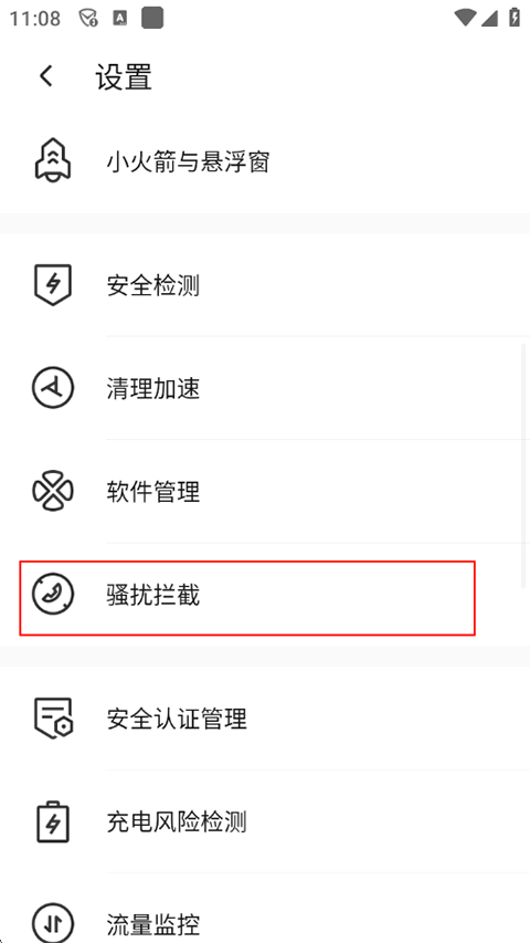 2、進入設(shè)置頁面點擊騷擾攔截;