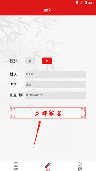 3、點擊解名可以查看這個名字的意思和系統(tǒng)八卦算法等