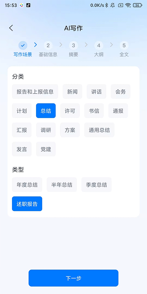 2、選擇寫作分類:報告、總結(jié)、 新聞 、講話等,類型:年度/季度/月度總結(jié)、述職報告等,點擊下一步;