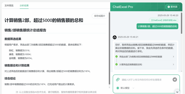 多條件求和的需求,工作中太常見了,學(xué)會(huì)下面兩個(gè)小妙招,你就笑了~比如求下面表格中:1.銷售2部;2.銷售額大于5000,同時(shí)滿足這兩個(gè)條件的業(yè)務(wù)員的銷售總額,則可以選擇用ChatExcel一句話完成,也可以選擇SUMIFS函數(shù)。