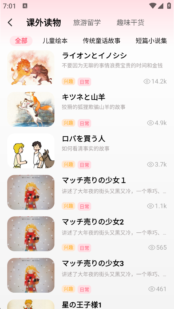文章讀物:分為課外讀物、考試留學(xué)、趣味干貨三個(gè)大類(lèi),配合日語(yǔ)和譯文,滿(mǎn)足日語(yǔ)初學(xué)者閱讀需求