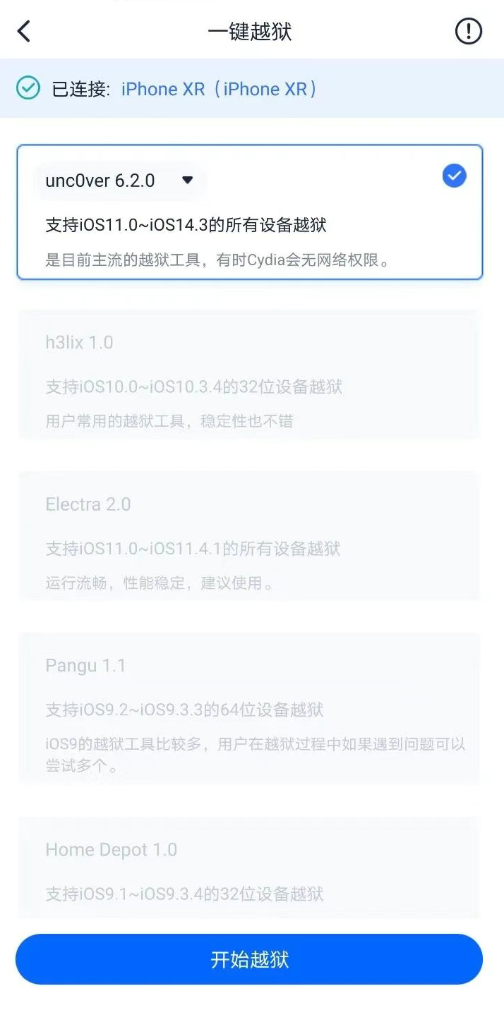 若有當(dāng)前 iPhone 支持的越獄工具,會在應(yīng)用界面中自動顯示,勾選后點擊“開始越獄”并耐心等待越獄工具安裝,安裝完畢即可在 iPhone 上打開越獄工具運行。