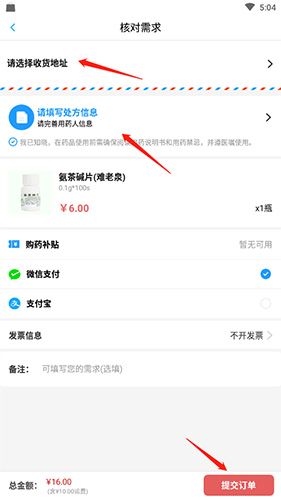 4、選擇收貨地址,完善用藥人信息,然后點(diǎn)擊“提交訂單”選項(xiàng)付款即可。